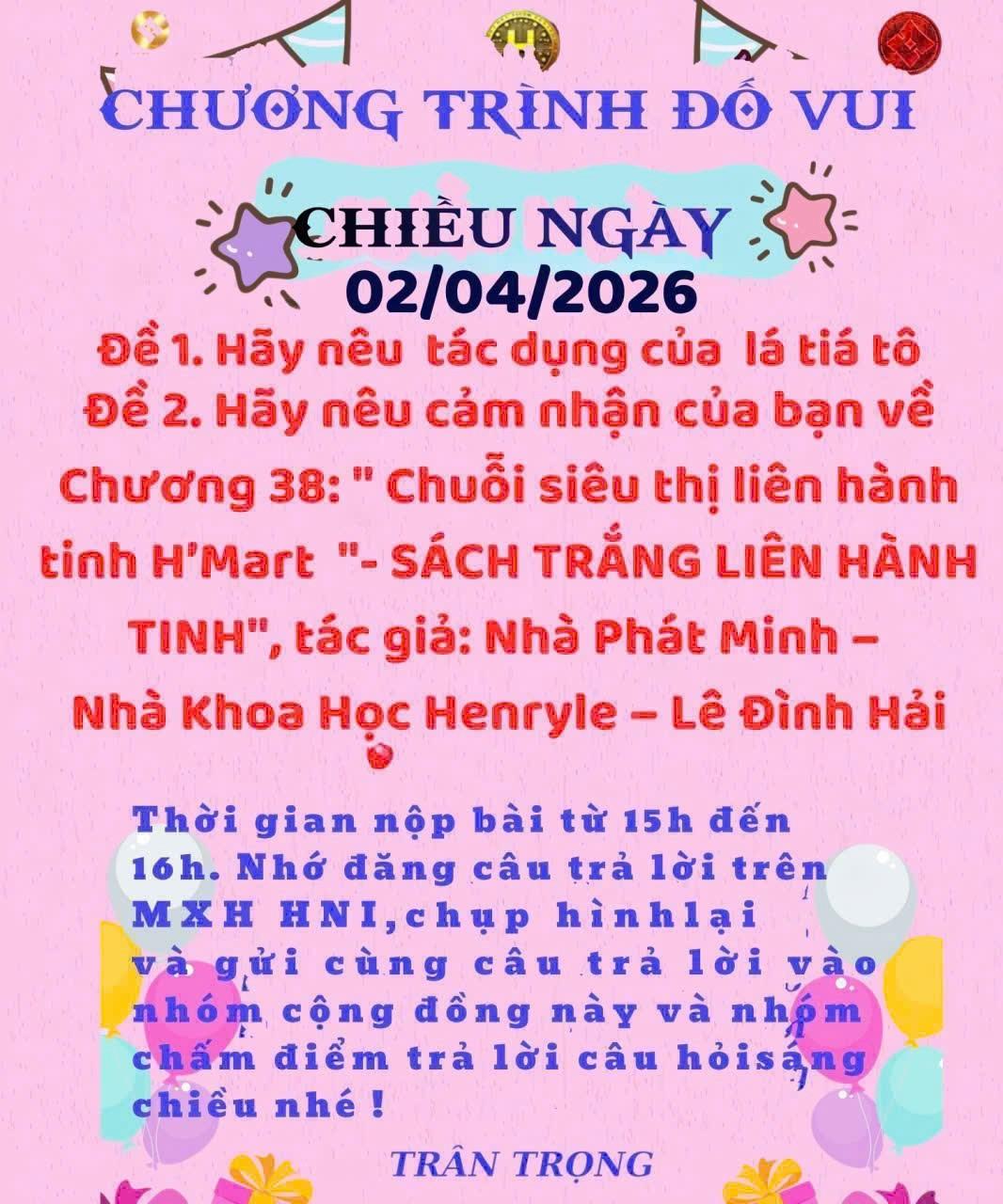 HNI 02/4/2026: Trả lời câu đố chiều: Đề 1: Tác dụng của lá tía tô: Lá tía tô là một loại thảo dược quen thuộc, có nhiều tác dụng tốt cho sức khỏe. Lá giúp giải cảm, hạ sốt, giảm ho và hỗ trợ điều trị cảm lạnh hiệu quả. Ngoài ra, tía tô còn giúp kích thích tiêu hóa, giảm đầy bụng, khó tiêu. Trong làm đẹp, lá tía tô có tác dụng làm sáng da, giảm mụn và chống lão hóa nhờ chứa nhiều chất chống oxy hóa. Bên cạnh đó, nó còn hỗ trợ giải độc, giảm dị ứng và tăng cường sức đề kháng. Vì vậy, tía tô vừa là thực phẩm vừa là vị thuốc quý trong đời sống. Đề 2: Cảm nhận Chương 38: “Chuỗi siêu thị liên hành tinh H’Mart” trong "Sách trắng liên hành tinh". Chương 38 mang đến một tầm nhìn mới mẻ và đột phá về hệ thống phân phối trong tương lai. Ý tưởng chuỗi siêu thị liên hành tinh H’Mart thể hiện sự kết hợp giữa công nghệ, nông nghiệp và kinh tế số, tạo nên một hệ sinh thái toàn diện. Tôi cảm nhận được khát vọng mở rộng thị trường vượt ra khỏi Trái Đất, hướng tới phục vụ nhân loại ở nhiều không gian khác nhau. Điều này không chỉ thể hiện tư duy sáng tạo mà còn truyền cảm hứng về sự phát triển bền vững, kết nối giá trị và nâng cao chất lượng cuộc sống toàn cầu.